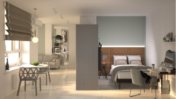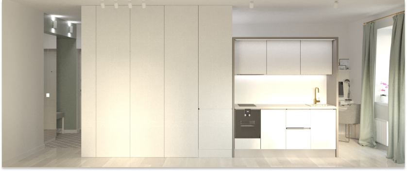 Projekt mieszkania został wykonany z uwzględnieniem jego przeznaczenia do wynajmu. Przestrzeń została zorganizowana w taki sposób, aby była funkcjonalna, przytulna i estetycznie atrakcyjna dla potencjalnych najemców. Główny nacisk położono na prostotę, funkcjonalność i minimalizm, co pozwala lokatorom łatwo dostosować wnętrze do własnych potrzeb